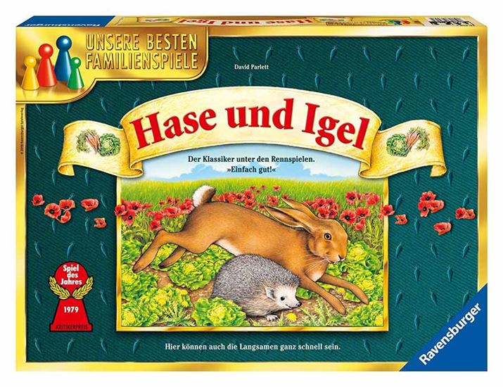 「ウサギとハリネズミ」のパッケージ。「ドイツ年間ゲーム大賞」受賞ゲームには、ひと目でわかる赤ポーンのマークが印刷される