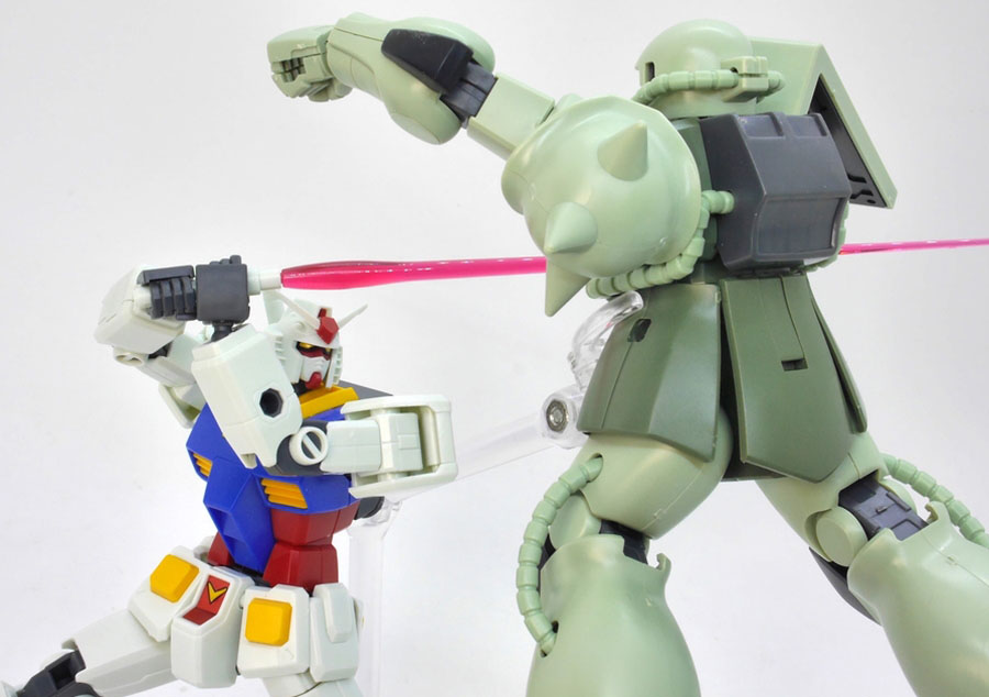 第1話「ガンダム大地に立つ!!」を再現。「ザク」を真っ二つにするガンダム! 表情付き平手手首パーツも左右分付属します