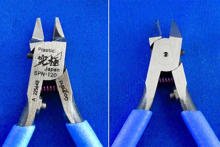 また、使っていくうちにゲート跡をより残さない方法も覚えました。アルティメットニッパーは両刃ではなく片刃で、切刃のもういっぽうは「まな板刃」という平らな断面になっています。このまな板刃は、断面の中心で切刃を受け止める構造になっていて、まな板刃でしっかりとパーツを押さえながら切刃でカットしていく仕組み。つまり、とがっている切刃と、平らなまな板刃は同じ厚さではないので段差が発生します。そこで、パーツに密着させてカットする場合は、まな板刃ではなくて、切刃を密着させてカットすることで、よりきれいにカットできるようになりました。