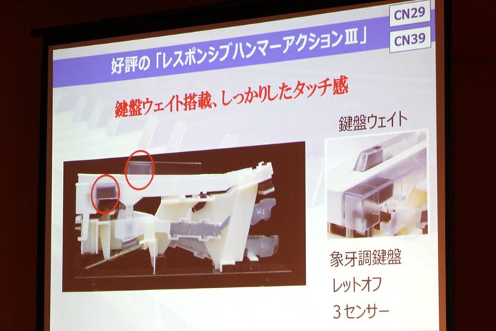 強みは、木製鍵盤に近いタッチを実現する「鍵盤ウェイト」を備えた88鍵の「レスポンシブハンマーアクションIII鍵盤」を搭載すること。ただリーズナブルなだけではなく、電子ピアノ選びで大事な「木製鍵盤のタッチ感」にこだわって開発されているのだ。もちろん今回発表されたCN29も、この鍵盤構造を継承している。