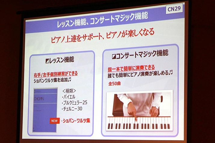 そのほかにも、左手と右手で個別練習ができる「レッスン機能」や、指1本で演奏ができる「コンサートマジック機能」などの従来機能を装備。ちなみに前者の「レッスン機能」には、人気の高いショパン・ワルツ集を新たに内蔵している
