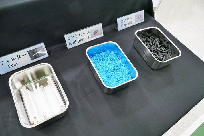 「プルーム・テック」のカプセルの材料。カプセルにタバコ顆粒を充填し、エンドピース、フィルターを装着してさらにパッケージ化する