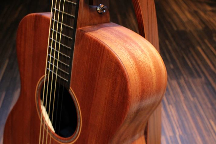 薄くて小ぶりなフォークタイプのボディに、ネックは通常よりやや短い634mmスケールで、やや低めの弦高を採用。このサイズなら、ギターに慣れていない人でも抱えやすくて押さえやすいはず。