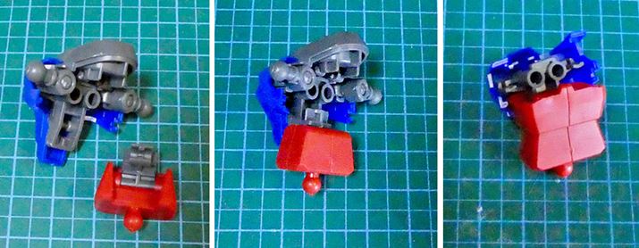 デスティニーガンダムは、胸部下部にポリキャップではなく、パーツをはめ込む方式。お腹の赤いパーツががっちりとハマってポリキャップを使わずに合体させます