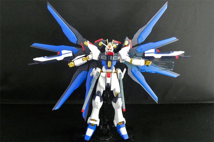 長射程ビームライフルは、左の握り手で持つことで前面への発射形態を再現可能。とどめは背中の翼にエフェクトパーツを付けて光の翼を再現。まさにてんこ盛り状態となっています。