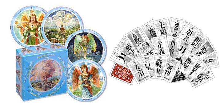 めずらしい円形デザインの「シャイニング・エンジェル・タロット」(左)や、カードに文字だけが書かれた「思考ツールとしてのタロット特製カード」(右)なんかもあります