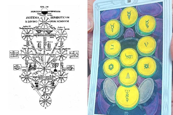左の画像が「生命の樹」(カバラでは「セフィロトの木」とも)。トート・タロット「ディスク10」カードの円の配置がそれにならっていることがわかります