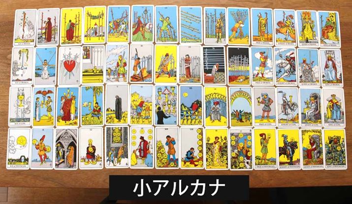 56枚の「小アルカナ」には、トランプのように「ワンド(棒)」「ソード(剣)」「カップ(聖杯)」「ペンタクルス(金貨)」の4種類のマークがあります。それぞれ1〜10までの数字カードと、「ペイジ」「ナイト」「クィーン」「キング」を加えた14枚で構成されています
