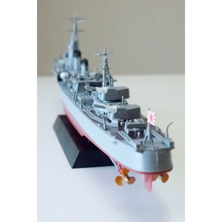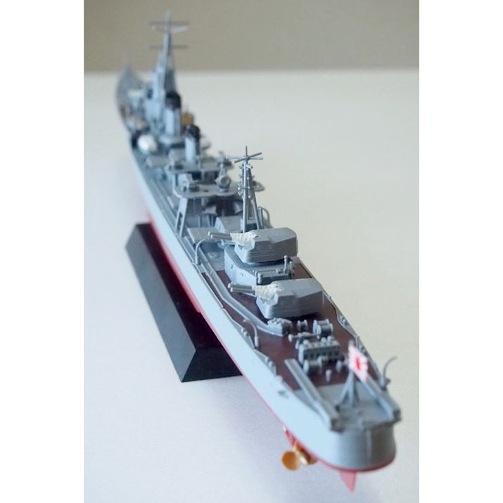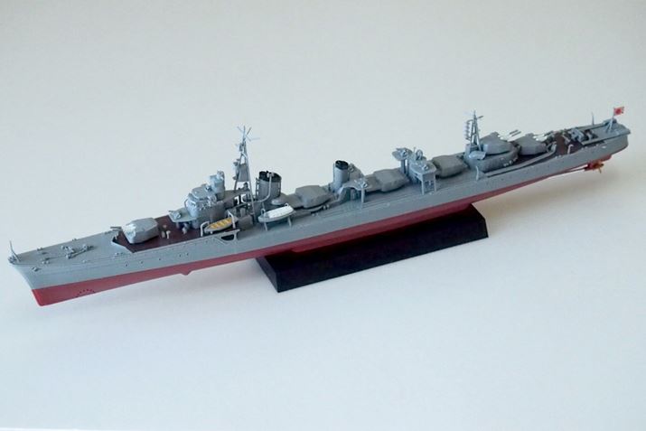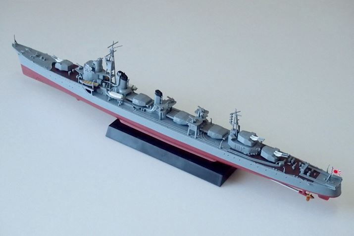 完成した「島風」を左舷前方から。艦橋、マスト、煙突といった構造物が、兵装の隙間に押し込まれるように配置されています