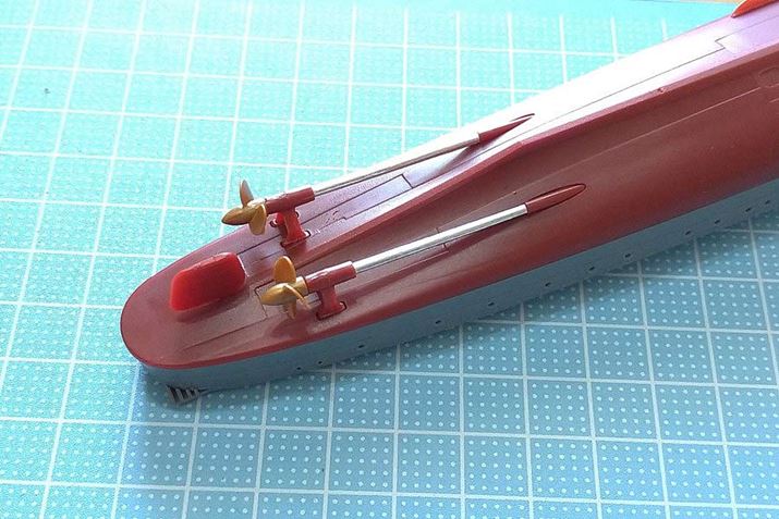 スクリューと舵を取り付けたところ。艦尾の船底は抵抗なく水が流れていきそうな、とてもなだらかな形状をしています