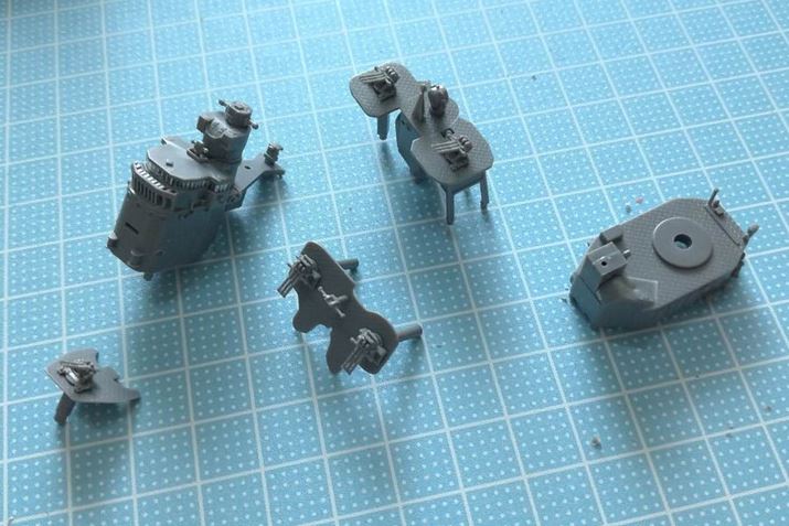 ここからは甲板より上の部分の製作が始まります。2本の煙突とその基礎部分に始まり、前後の艦橋、対空機銃とその台座を組み立てていきます。