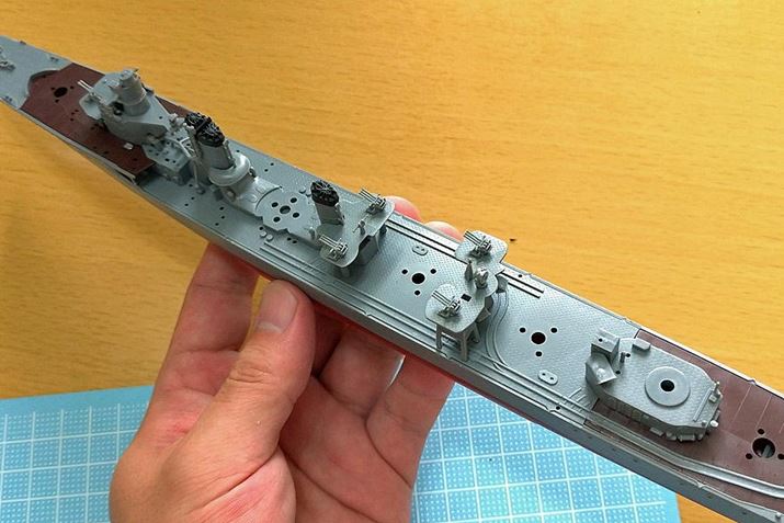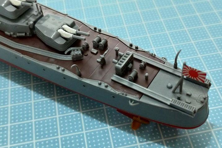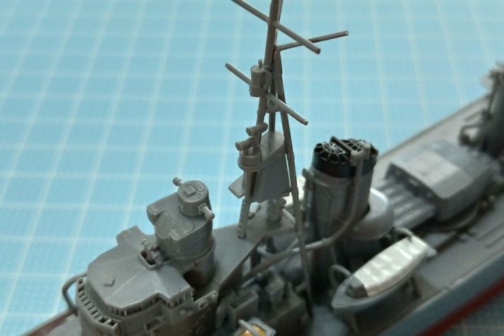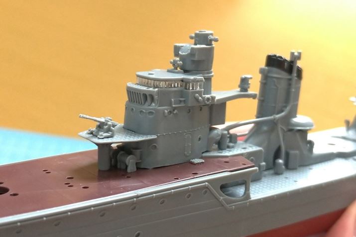 艦橋などを取り付けたところ。主砲や魚雷などの兵装と交互に配置されているので、この時点ではちょっとスカスカな印象です
