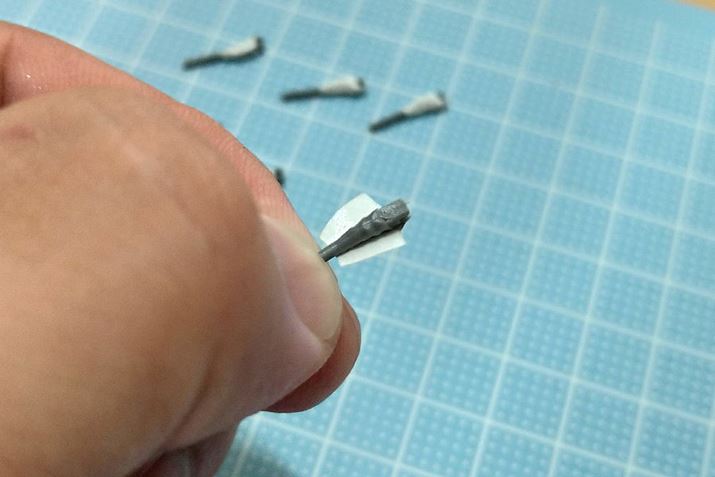 平仮名の「し」と片仮名の「ス」を合わせたような形をしたダビットと搭載艇を、あらかじめ接着しておきます