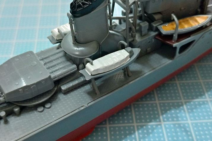 茶色い甲板の搭載艇は船体とダビットが別々になっているので組み立てやすいのですが、白い防水布付きの搭載艇はダビットで吊るような構造が再現されていて、ピタリと組み立てるのが非常に難しく、細いダビットのパーツを折ってしまいそうでヒヤヒヤしました。
