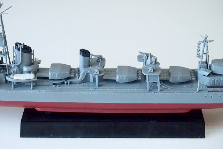 その後はスムーズに取り付けが進み、船体の基本構造が完成。どっしりと重厚さを感じた「武蔵」とは異なり、縦横比の大きな船体は刀剣を思わせるようなカーブを描いており、高速を追求した駆逐艦ならではといった趣があります。