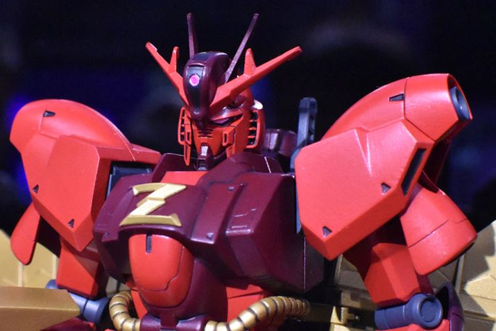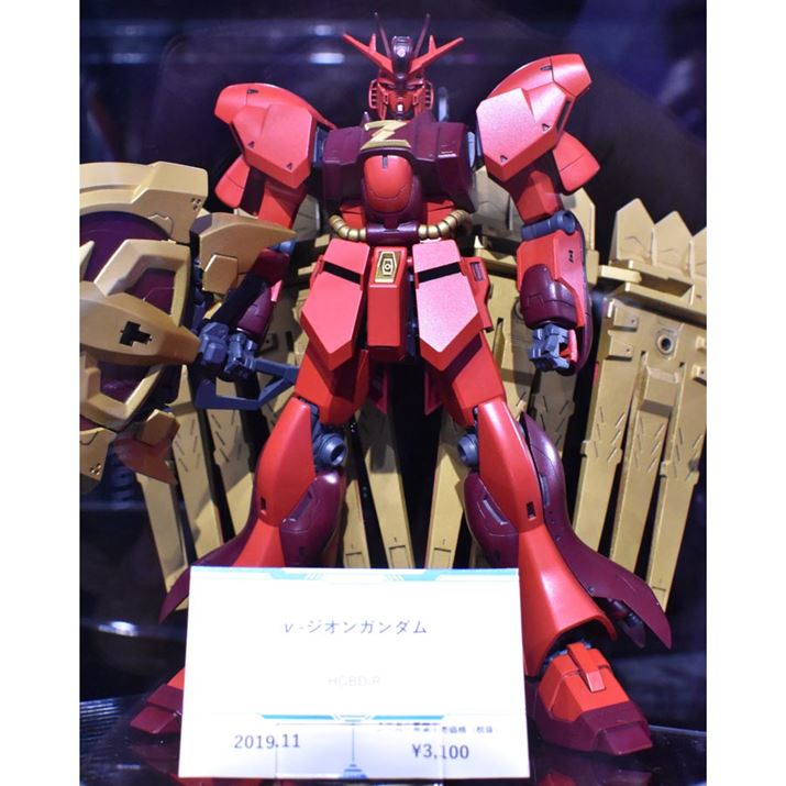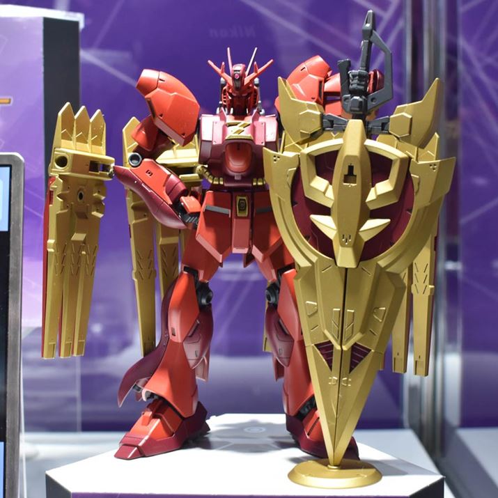 「HGBD:R 1/144 ν・ジオンガンダム」。赤と紫に染まったガンダムが、金色の巨大な「ジオニックソード」と、「νガンダム」の「フィン・ファンネル」のような金色のパーツを装備する