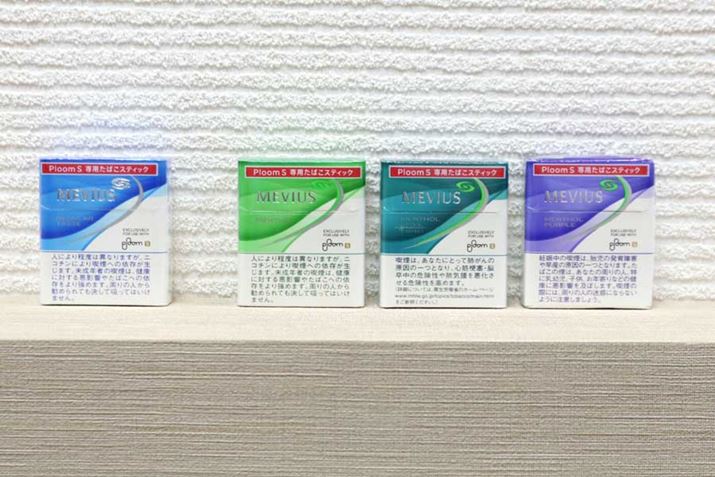 「プルーム・エス」のたばこスティックは計4種類に。左から、唯一のレギュラー「メビウス レギュラーテイスト フォー プルーム・エス」、ペパーミント系の「メビウス メンソール フォー プルーム・エス」、冷感系の「メビウス クールエフェクト フォー プルーム・エス」、新発売の「メンソール・パープル」