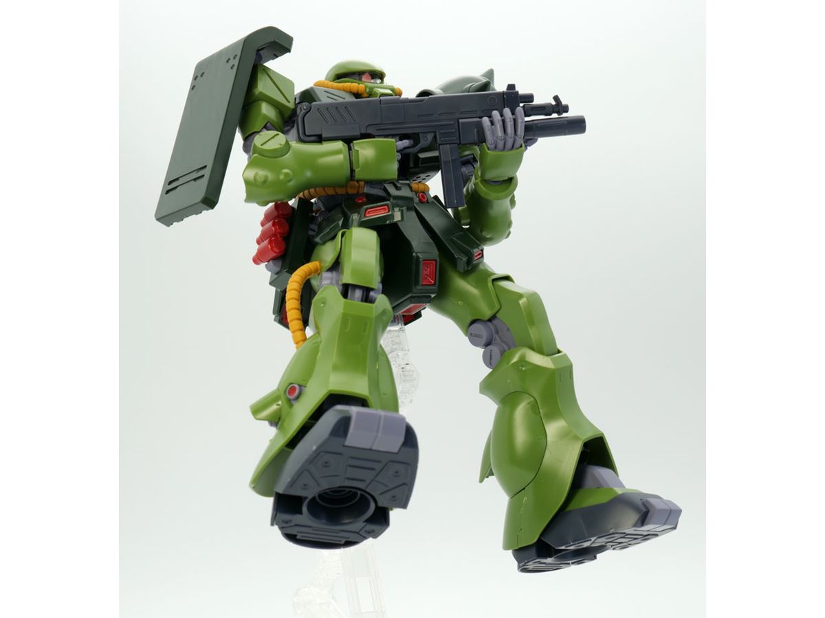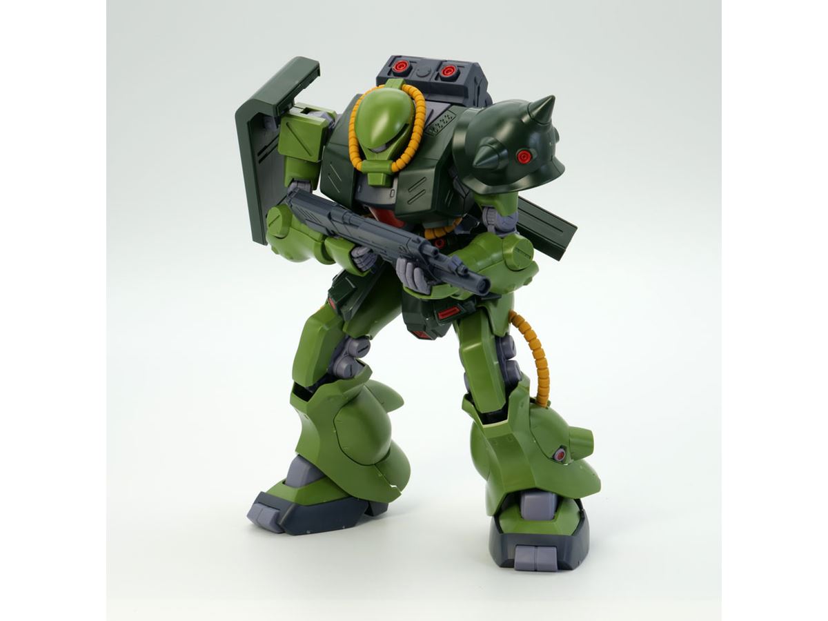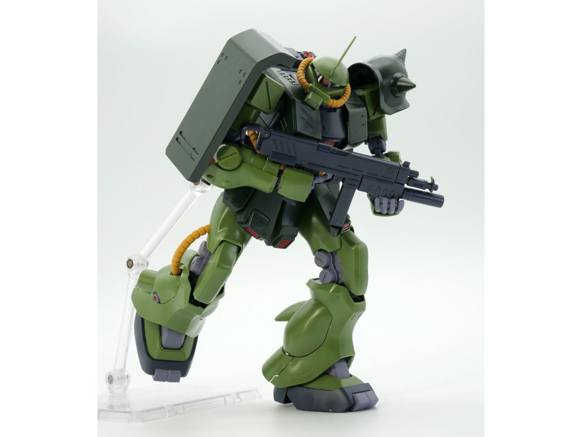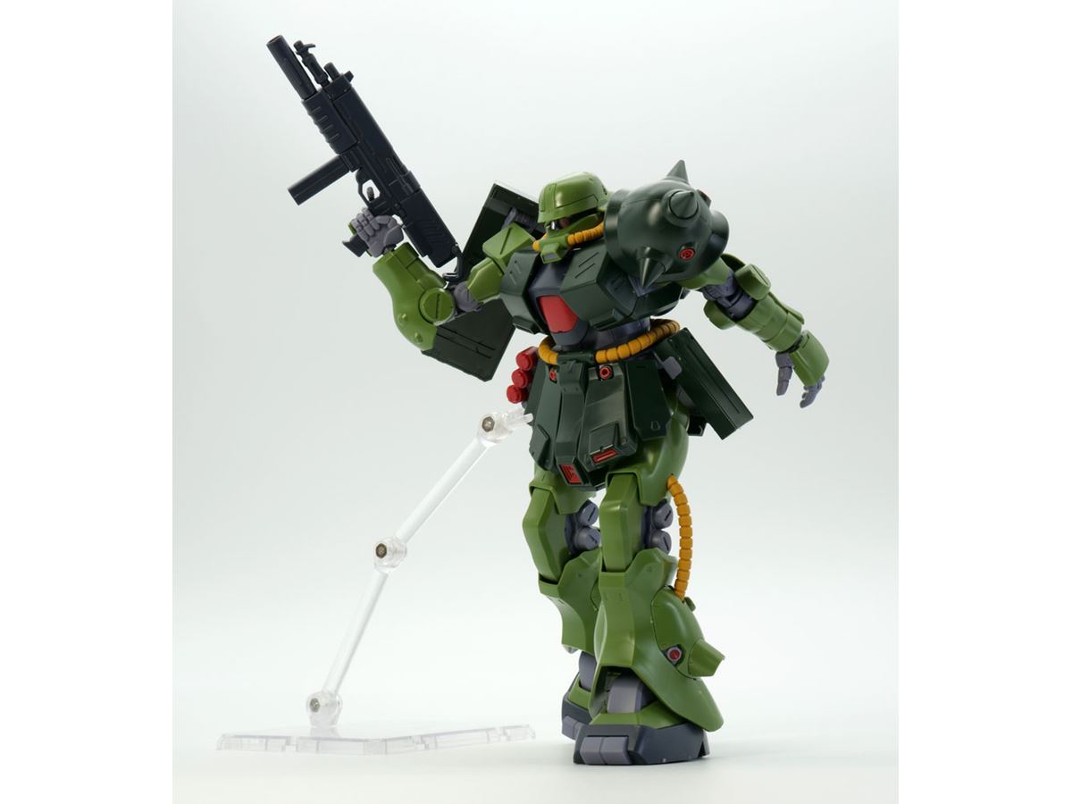 まずは「ザクII改」の設定を簡単におさらいしてみます。ザクII改はアニメ作品「機動戦士ガンダム0080 ポケットの中の戦争」に登場し、「統合整備計画」により開発されたザクバリエーションのひとつ。劇中ではサイクロプス隊のバーナード・ワイズマンが「ガンダムNT-1(アレックス)」と死闘を演じ、ガンダム作品としては大変珍しい「ガンダムを大破に追い込んだザク」という偉業を成し遂げたザクタイプでもあります。