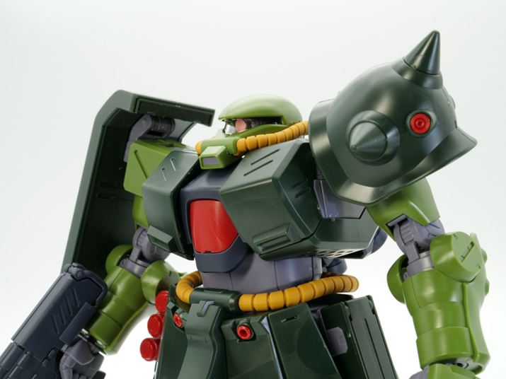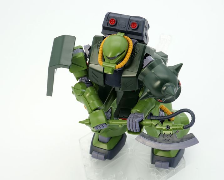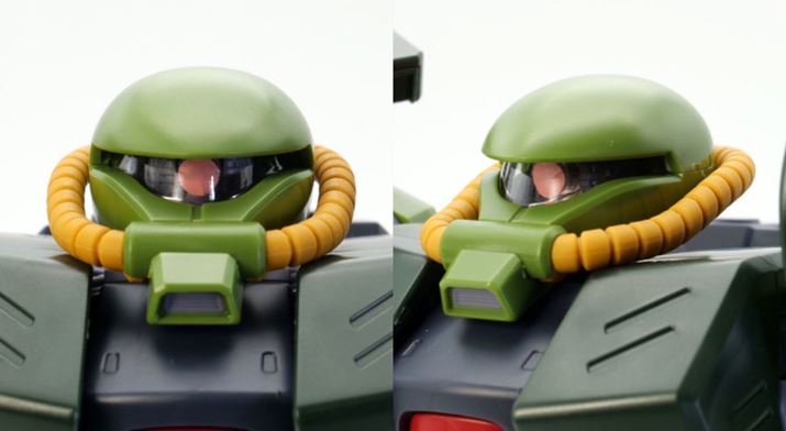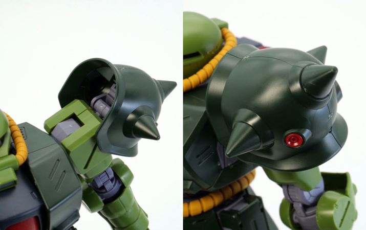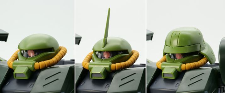 頭部は劇中や設定画と同様に、普通のザクII(MS-06)と比べると上からつぶしたような特徴的な形状で立体化されています。モノアイを覆う部分はクリアパーツ、動力パイプは軟質素材が使われています