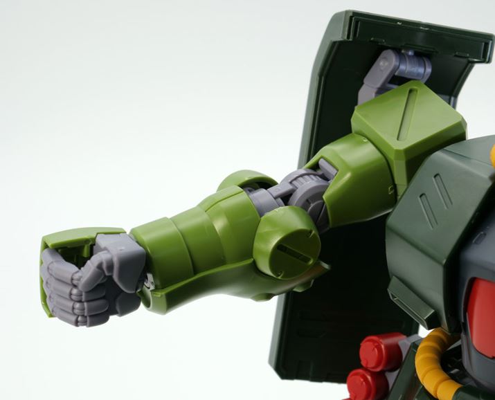 具体的に言うと、まずは「MS-06ザク」やHG版とは違う「肉付きのいい」体型バランスで立体化されている点。また、関節パーツの成形色がグレーではなく「青みがかったミドルブルー」で再現されているのも「劇中に似せる」こだわりを感じる部分です。そして極めつけは脚付け根のスライドギミックによる「アルを手に乗せるシーン」や「アレックスとの最終決戦」のポーズが簡単に再現できる点。