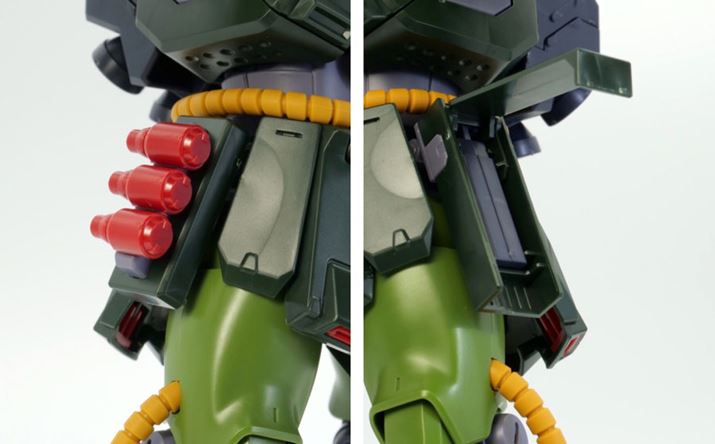 腰部右側にはハンドグレネードを3つ装備。それぞれ着脱可能です。左側はカバーが開閉し、中に予備の給弾マガジンを装着できます