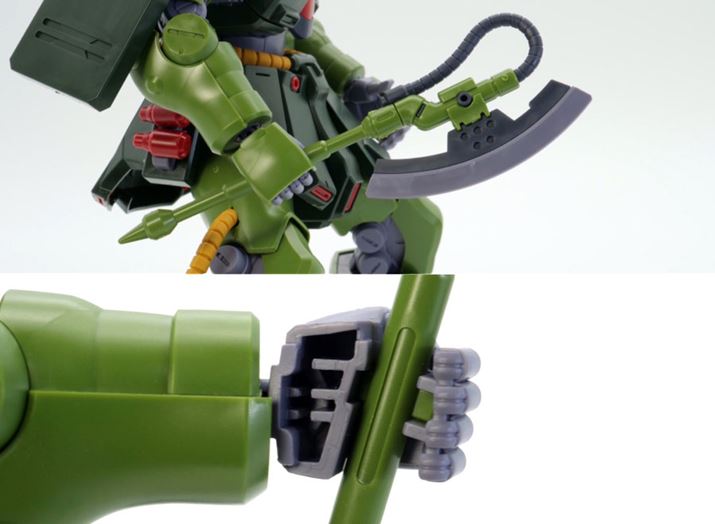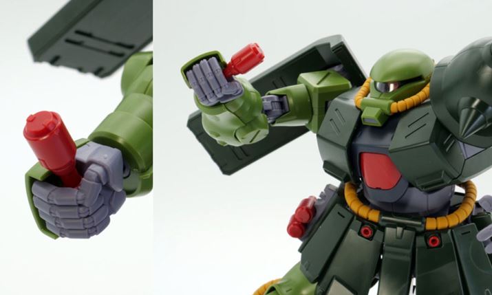 手持ち武器は「MMP-80 90mmマシンガン」「ヒート・ホーク」「ハンドグレネード」の3種類が付属します。それではザクII改に持たせつつ、アクションポーズをさせながら見ていきたいと思います!