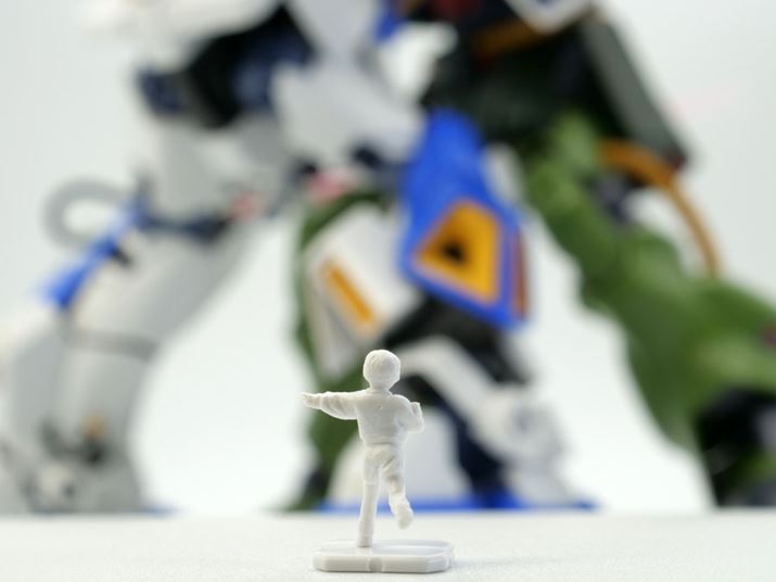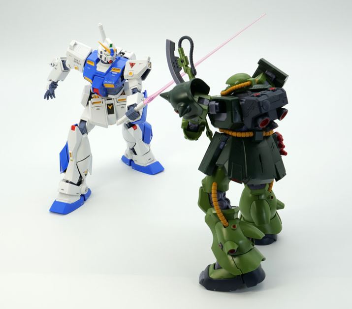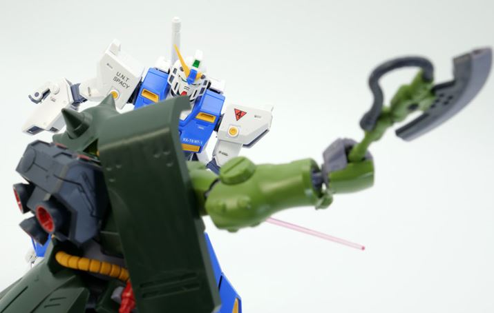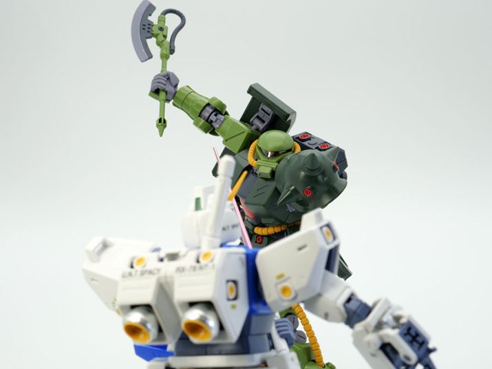 このように、「アルを手に乗せるシーン」「アレックスとの最終決戦」といった劇中で印象深いシーンが容易に再現できました。今回のRE/100 ザクII改、単に可動域が広いだけではなくまるで劇中から出てきたようなプロポーションで立体化されているのも売りだと思います。ちなみに「MGガンダムNT-1 Ver.2.0」には今回使用したアルのフィギュアのほか、バーナード・ワイズマンのフィギュアも付属します。並べて飾ると非常に「絵になる」ガンプラだと思います!