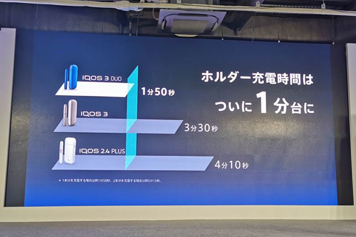 連続喫煙が可能なデバイスとしては、すでに「アイコス 3 マルチ」(10本連続喫煙可能)がラインアップされているが、1回の本体(チャージャー)への充電で吸える本数は「アイコス 3 デュオ」(約20本)のほうが多い。