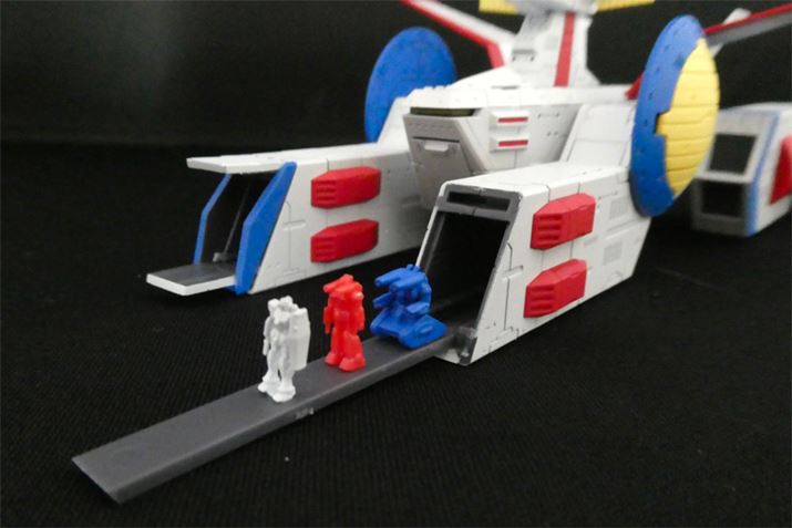 MSデッキ部分を開いてカタパルトを引き出し、付属のモビルスーツを並べます。わずか8mm弱の白いガンダム、赤いガンキャノン、青いガンタンクが付属