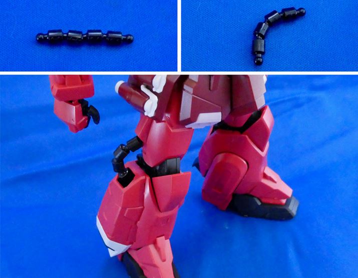 成形された軟質パーツの動力パイプ。腿部とすね部に差し込むだけで、脚の動きに合わせて動力パイプも可動し、ポロリもありませんでした