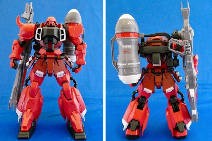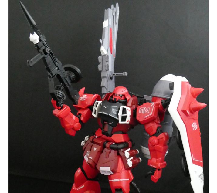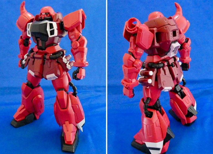 本体完成です。まずはガナーウィザードを装備しないノーマルのザクウォーリア状態から。赤の濃淡やポイントの白や紫などのパーツもすべて塗り分けされています