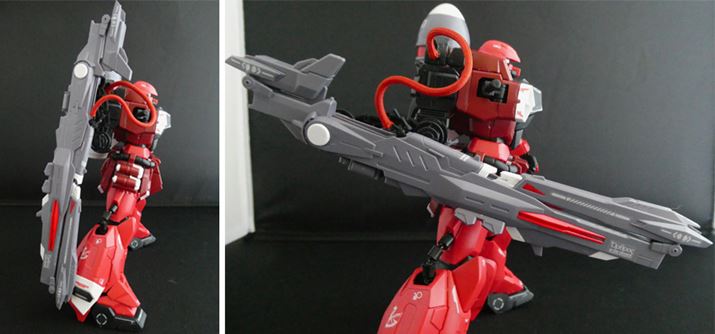 本体より大きな「オルトロス高エネルギー長射程ビーム砲」(以下、オルトロス)とエネルギータンクが一体化されたパーツを背中に取り付けます。バックパックのように取り付けるのですが、これが本体にしっかりハマり、可動させても本体から抜け落ちることはありませんでした。オルトロスはバックパックから自在に可動させられるようになっており、砲撃ポーズをとらせるときは、本体を展開し、右脇に抱えるようにして持つことができます。