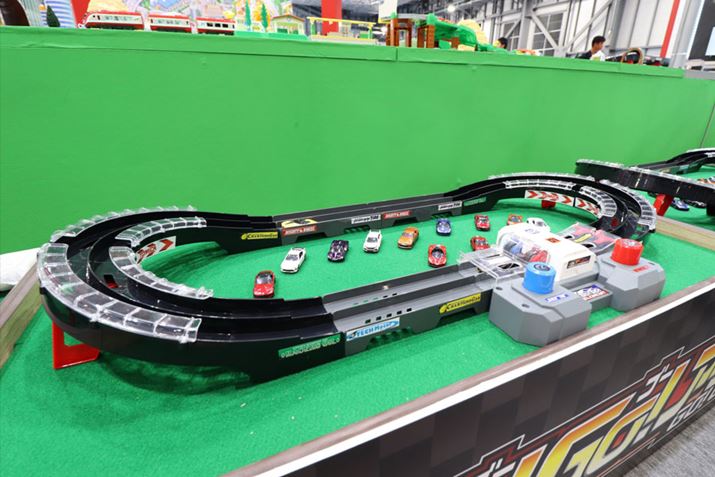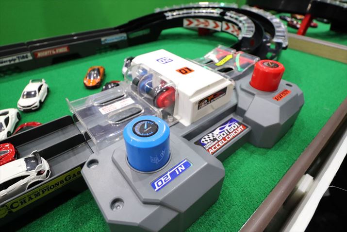 トミカの関連商品では、12月発売予定の「トミカスピードウェイ GO!GO!アクセルサーキット」が初お目見え。一見、ミニ四駆のコースに見えるこのサーキットは、ボタンを連打することで内蔵のローラーが加速。トミカを勢いよく押し出し、走らせるというものだ。450mmのバックストレート、最大15度のバンクがついたコーナーをトミカが駆け抜ける。ポイントは、電池を使わずに遊べることだ。