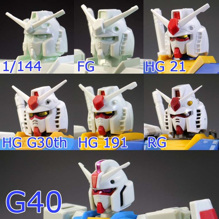 まずは頭部を比較。どのキットも顔付きが違いますが、今回のガンダムG40は「頭頂部トサカ部」にピンクのラインが入っているのが特徴です