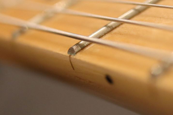 1万円台のギターのフレットをアップで撮影した画像。フレットの端をただ切り落としただけになっているので、この部分が手に引っかかってしまったりします