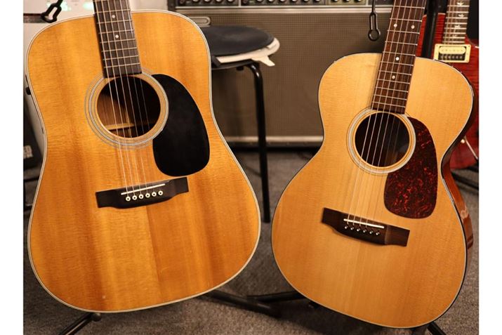 こちら、左がMartin「D-28」で右が同じく「0-18」。同じアコギでも、大きさにかなり差があることがわかりますね