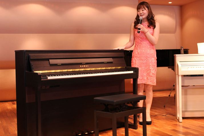 CA99のデモ演奏を行ったピアニストの日高志野さん。ソフトペダルのハーフ機能についても「音の細かい表現が可能で、ストレスなく演奏できる」と感動した様子
