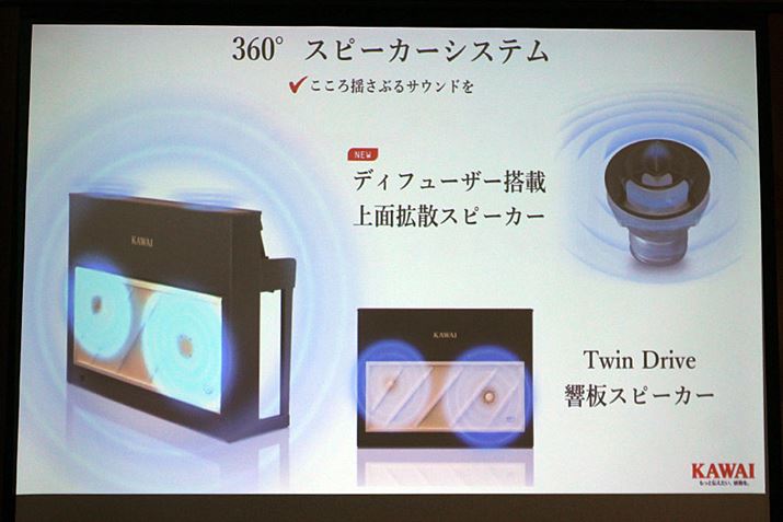 背面の響板に「低音用」と「中高音用」と2種類の加振器を内蔵する「TWIN DRIVE 響板スピーカー」で、360°方向に広がる豊かなサウンド再生を実現。内部スピーカーには新しくディフューザーを配置し、音を効果的に拡散。強打時にはダイナミックに、弱打時には静かなサウンドを再現する