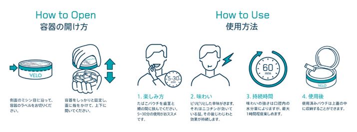 使用法は、歯茎とほおの内側の間に挟むだけ。電気も火も必要とせず、副流煙も発生しない。口の中の水分量によって差は生じるが、最大1時間ほど味が持続する