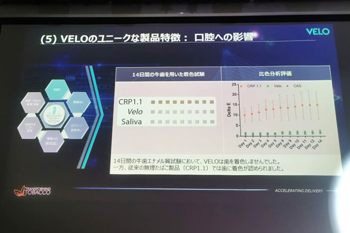 「ベロ」の原料はEUの食品基準を満たしたものであり、喫煙関連疾病の主たる要因とされている化学物質の含有量は、紙巻きタバコと比較して99%、従来の無煙タバコと比較しても76%低減されているといい、数々の試験によって、ほかの喫煙具よりはるかに健康リスクが低いことが立証されているという。