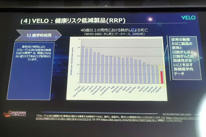 紙巻きタバコ利用者の60%以上が無煙タバコへ切り替えているというスウェーデンは、EUの中でもっとも「40歳以上の男性が肺がんで死亡する率」が低い