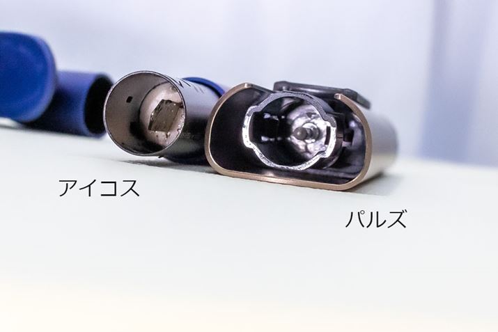 左がアイコス、右がパルズ。構造的に吸い応えが強くなりやすい直接中心加熱式の2機種