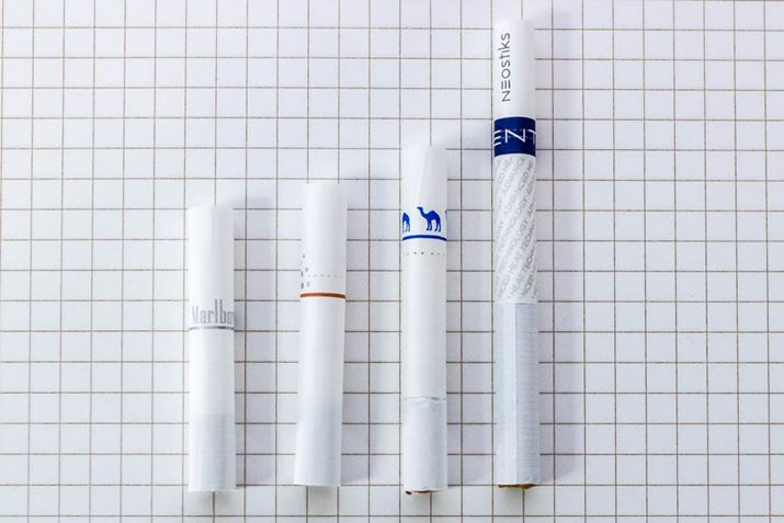高温加熱式デバイスの専用スティック(リフィル)比較。左から「アイコス」「パルズ」「プルーム・エス」「グロー・ハイパー」。4種の口径はほぼ同サイズになったが、長さが違うので互換性があるのは「アイコス」と「パルズ」のみ