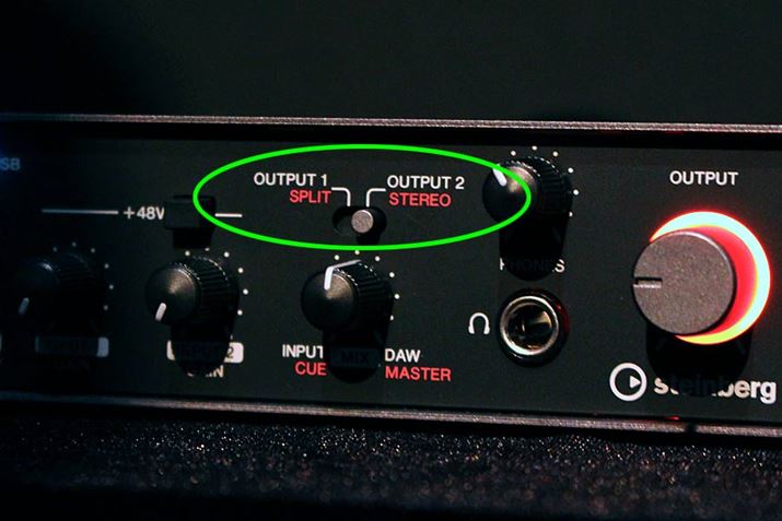 「DAW」または「DJ」のモードに設定したうえで、本体フロントにある「OUTPUT」スイッチを使うと、モニターするアウトプットを切り替えることができるようになっている