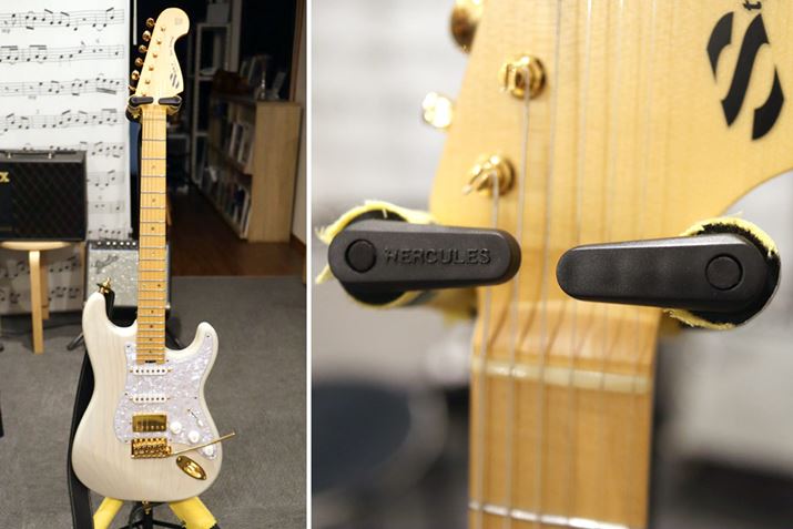 ちなみに、私が個人的に好きで使っているのが、「HERCULES GS414B PLUS」というギタースタンドです。このスタンドは、ギターの自重でネックをロックしてくれますので、大切なギターを倒してしまうことがありません。また、一般的な立てかけ式の場合、常にギター本体の重量がネックに乗っていることにより、反りの原因になることがあるのですが、このスタンドのはギターを吊り下げるタイプなので、ネックへの負担がかなり軽減されます。