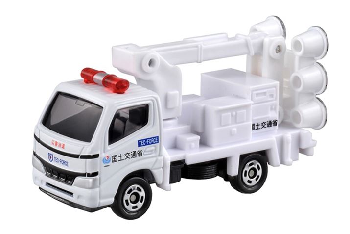 画像は、トミカの「国土交通省 照明車」。災害現場などで作業をする際に、周囲を明るく照らしてくれる大型照明が搭載されています。TEC-FORCE(緊急災害対策派遣隊)のロゴや国土交通省のシンボルマークまで正確に再現されており、積載されている照明アームは実際に稼働させることもできます