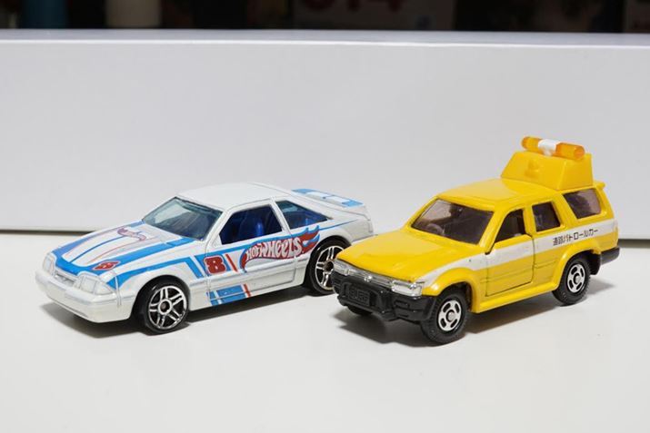 博人さんがお気に入りのホットウィール「92年型 フォード マスタング」(左)と、トミカ「トヨタ ハイラックス 道路公団パトロールカー」(右)