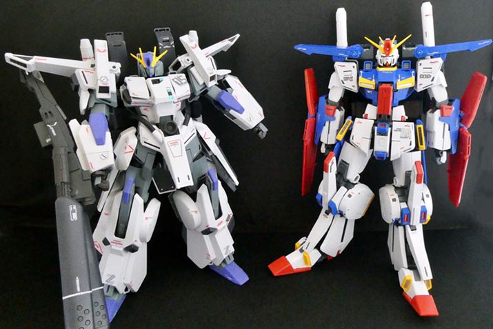 オリジナルの「ZZガンダム」と並べて。カラーリングが異なるのはもちろんですが、追加装甲のボリューム感がすごいです