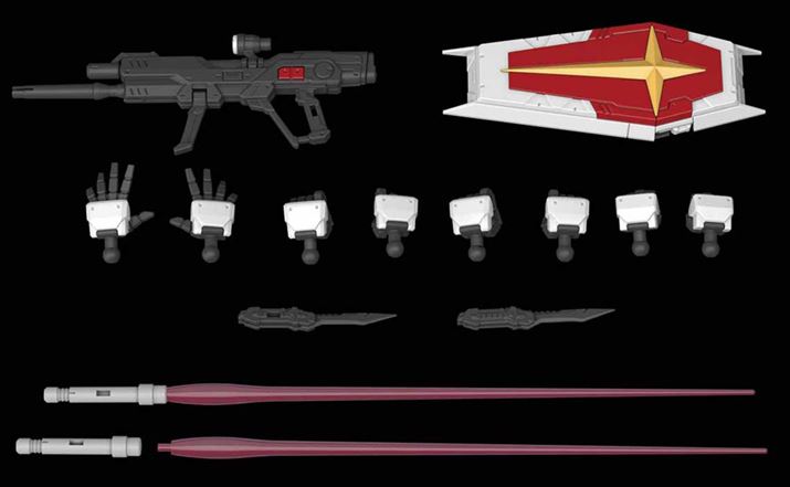 「ビームライフル」「シールド」「ナイフ」「ビームサーベル」に加え、握り手、平手、武器持ち手など、左右各4種のハンドパーツが付属
