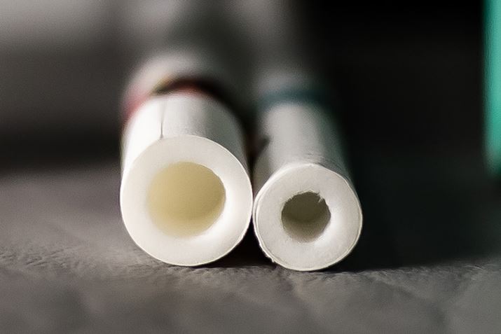 スティックを見ると、一目瞭然。左が「グロー・ハイパー」用、右が従来のグロー専用スティック。フィルターの真ん中の穴がより大きい口径になった
